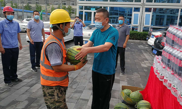 慰问中,李主任亲切看望顶烈日、冒酷暑工作在建设一线的项目成员,为他们送去五十余箱饮料、饮用水和二百余斤西瓜等慰问品,询问大家的工作及生活情况,详细了解当前项目进展。