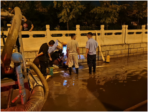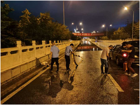 19时30分,区住建委传达防汛排涝应急抢险救援命令:“万星市场铁路桥涵下,积水十分严重,行人车辆都无法通过,给市民造成不便和危险。抢险队需前往抽干积水、清除淤积杂物。”接到命令后,集团公司立即响应区住建委号召,迅速启动“防汛应急预案”,由集团公司副总经理、总工程师陈劲亲自披挂上阵,全面部署极端天气下的应急处置工作。为确保当天抢险工作顺利开展,由集团公司承建的101中学怀柔校区扩建项目应急抢险队立即进入备战状态。项目经理、抢险队队长张二祥快速组织13名防汛值班队员将防汛物资、设备装车,第一时间奔赴抢险点,按预案分工有条不紊进行设备安装积水抽排。经过一个半小时的艰辛努力,万星市场铁路桥涵下终于恢复原貌,市民和车辆顺利通行,抢险队顺利圆满完成了应急抢险救援任务,得到了广大市民和区住建委的一致好评。